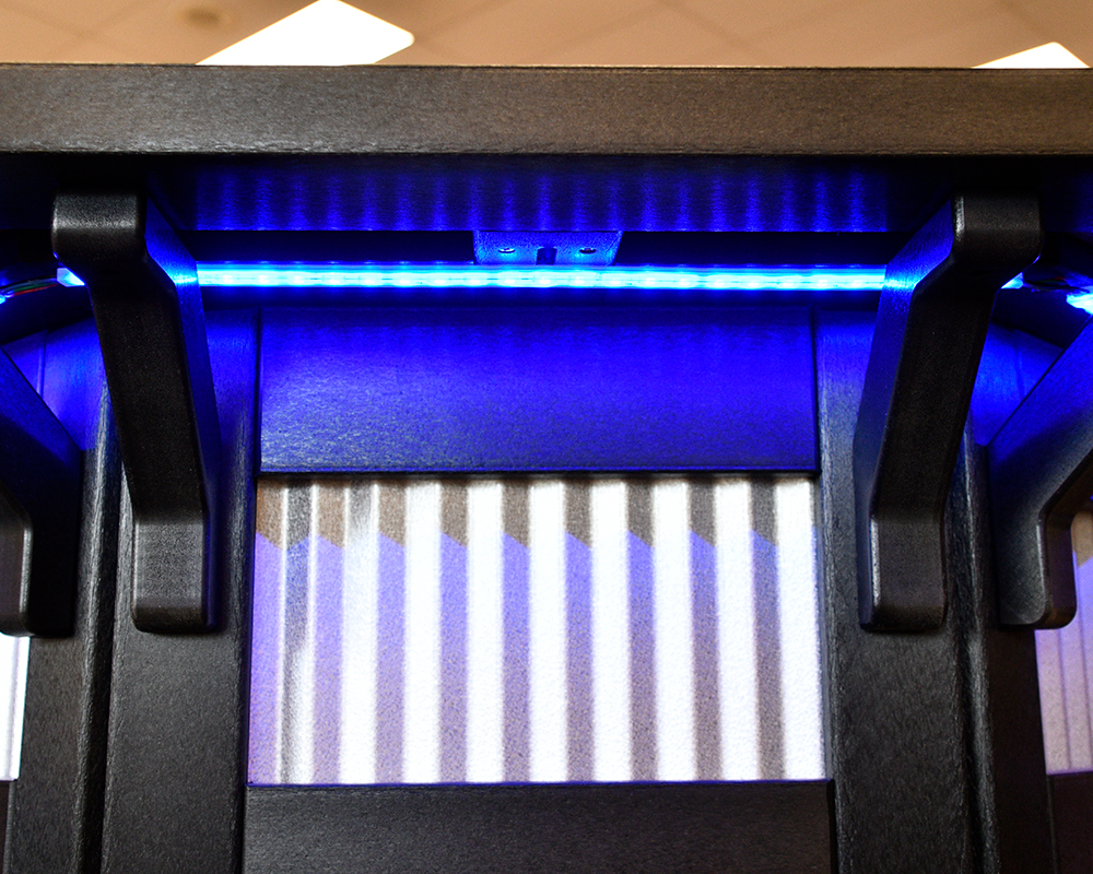 • Modular Bar: This bar is a modular set, made up of 5 bar pieces that can be rearranged for a new bar layout. Each straight bar piece has a shelf inside. The bar features corrugated galvalume metal fronts, upper panels, and a LED light strip with a remote.